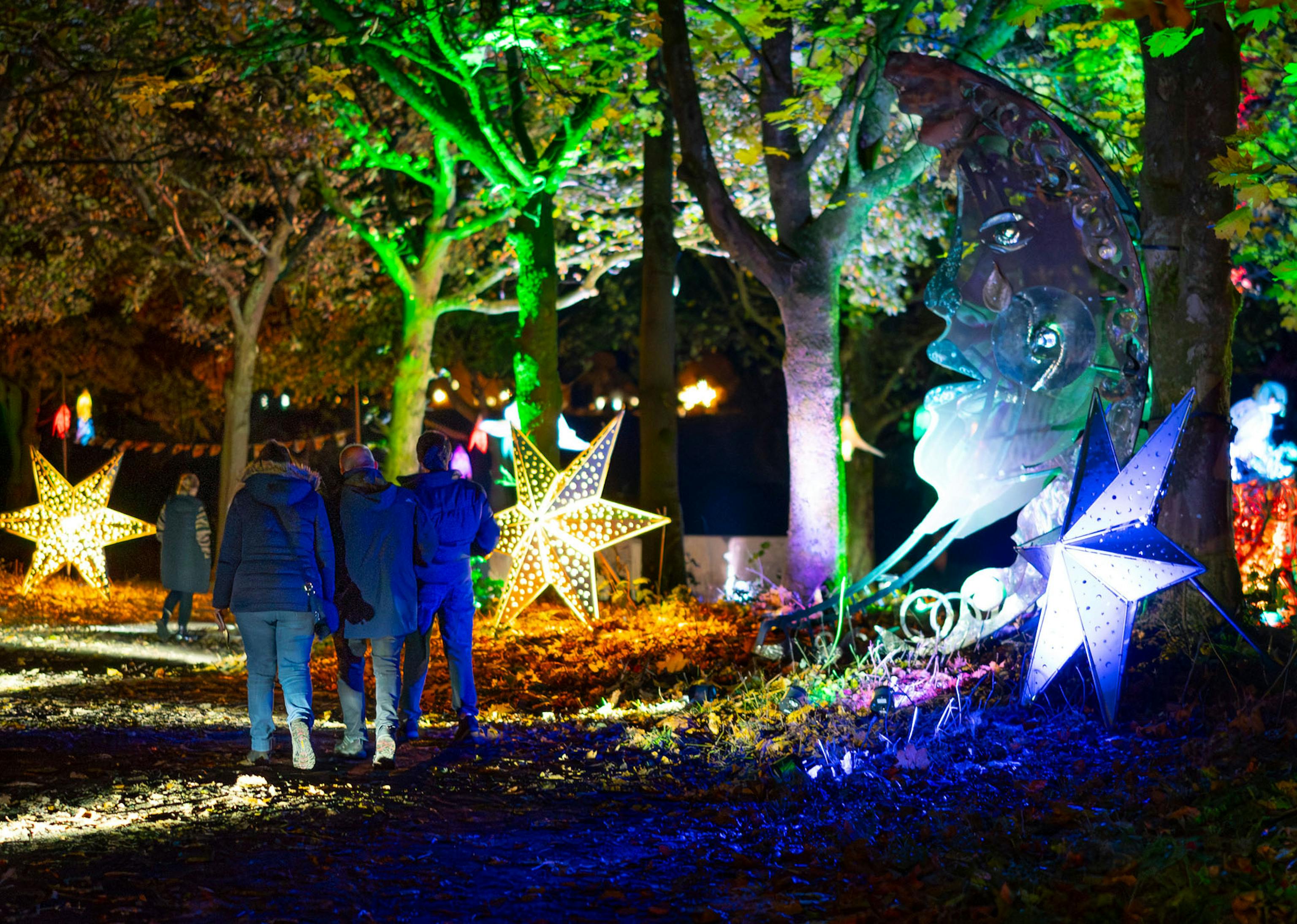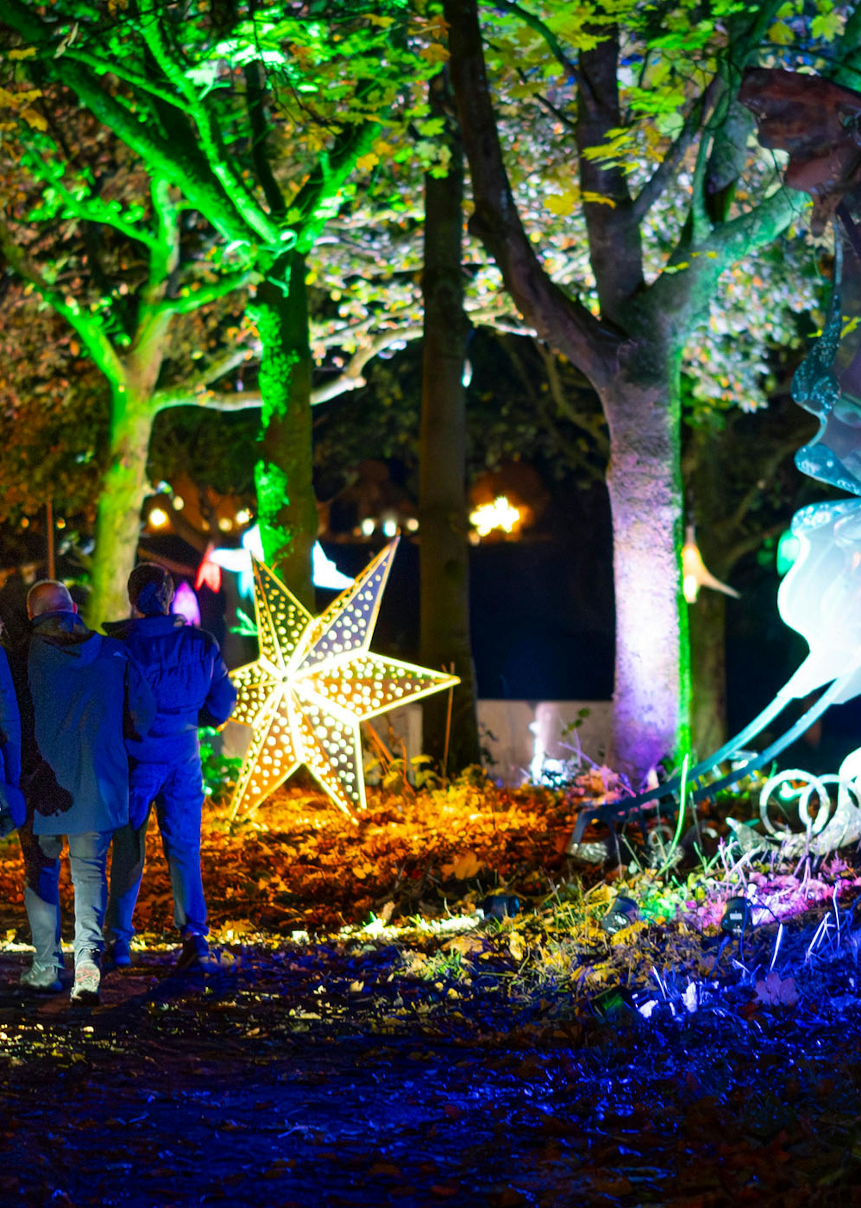 Delight audiences as they wander through the outdoor space, animated by four steel laser cut star light sculptures, and a hand plasma cut steel moon, lit with external lighting, creating shadows and illuminating the many textures of the surface of the sculpture.